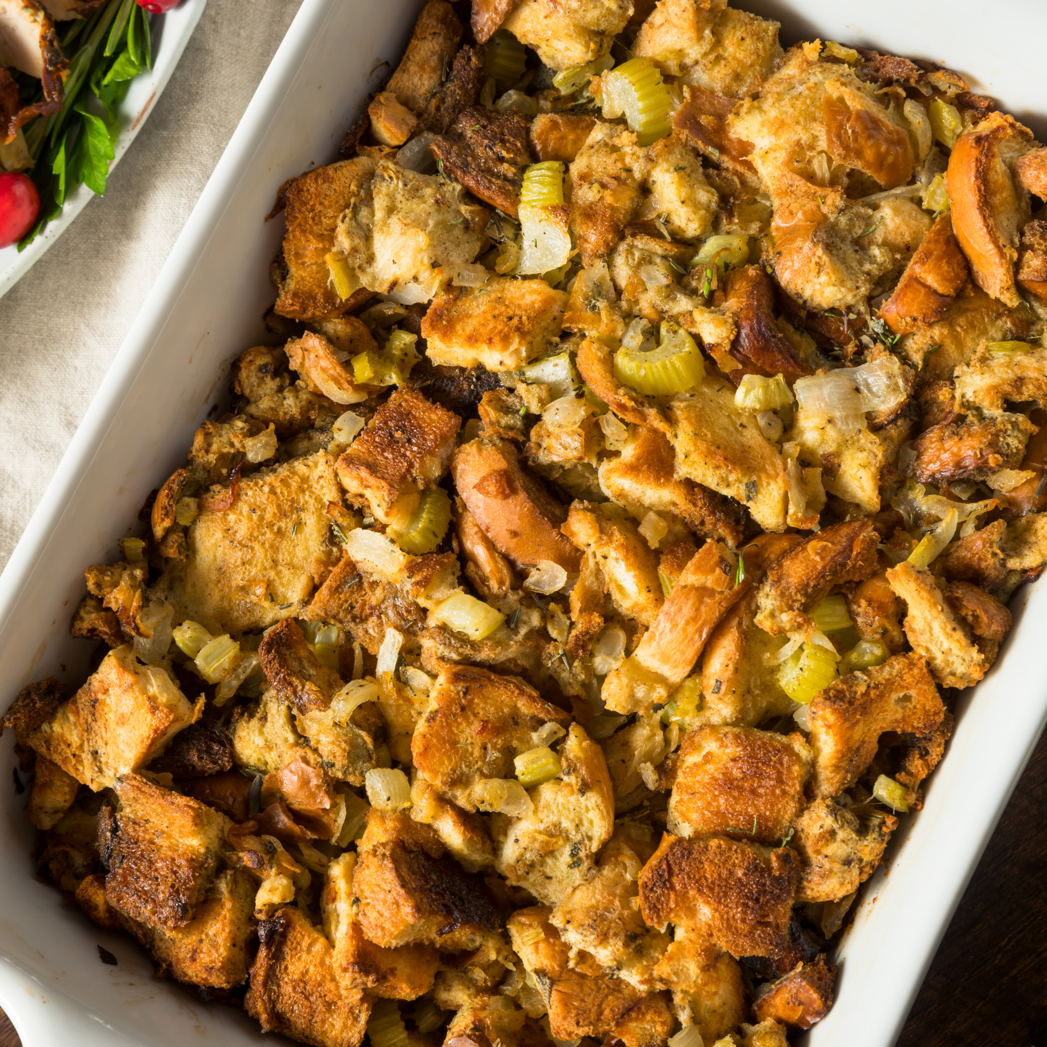 Toasted egg challah, sauteed aromatics (carrots, onion, celery), and slow brewed stock elevate this holiday favorite. You'll find tons of flavor in this stuffing. It is made from scratch without any bagged croutons or prepackaged mix.