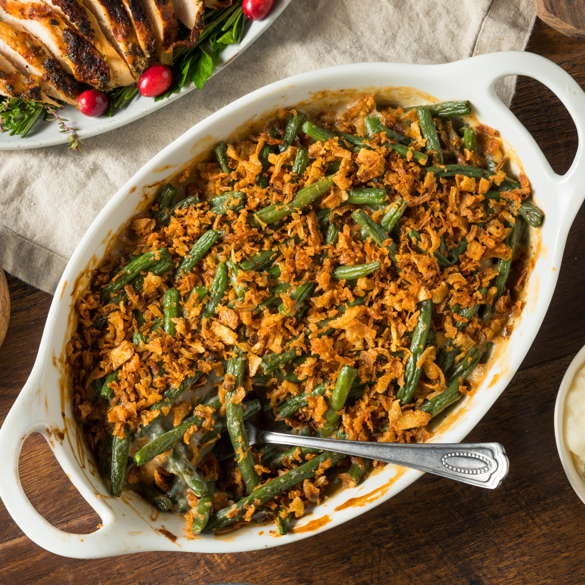 A grown up casserole, Fresh blanched green beans, sauteed mushrooms and onion shoestrings. (contains chicken broth)